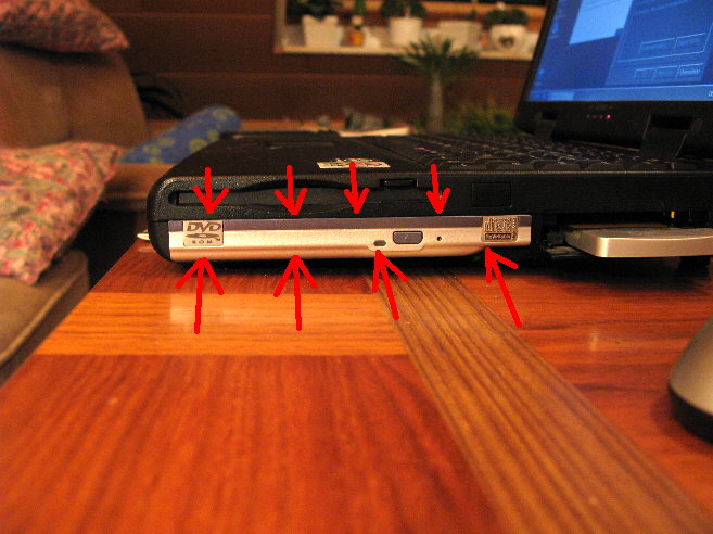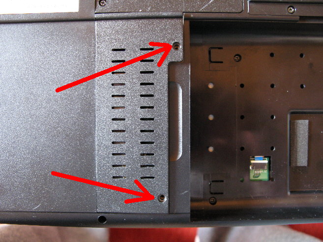 Schritt 1 : Das alte vorhandene CD-ROM ooder DVD-ROM Laufwerk ausbauen. Hierzu die beiden oben markierten Schrauben und Kunststoffabdeckung entfernen.