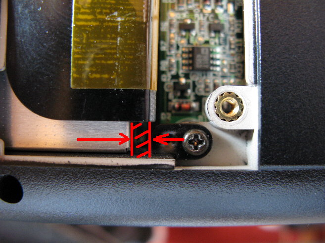 Schritt 9: Oben sieht man markiert das maximale "Spiel" welches einem die Langlöcher in der Einbauschiene ermöglichen. Nachdem nun die Frontblende passend zurecht gefräst wurde, kann man das Laufwerk nun vorsichtig einschieben und mittels der "schwarzen Kunststoff Einbauschiene" mit den Langlöchern, so am Laufwerk ausrichten, dass sich diese festschrauben lässt. Durch die Langlöcher kann man nun die Schiene so anbringen, dass die weiter in den Laptop -und final der Haltebohrung- reicht und alles fluchtet. Abschliessend nur noch den Folienverbinder wieder einstecken; deckel drauf und Rechner starten...