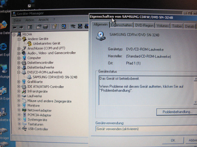 Nun wird der Rechner automatisch ein neues Laufwerk erkennen und auch korrekt im Gerätemanager anzeigen. In meinem Fall das "Samsung CD-RW/DVD SN324B" Combo-Laufwerk. Weiterer Vorteil dieses Laufwerkes ist, dass es ausnahmeslos ( was bei den Original-Laufwerken dieses alten Laptops leider nicht der Fall ist ) alle DVD-Medien absolut problemlos erkennt und lesen kann. Egal ob DVD-ROM; DVD-R; DVD-R; DVD-RW; DVD+RW und nebenbei dann auch noch CD-Rs und CD-RWs rel. flott brennen kann. Hierfür muss man allerdings ein Brennprogramm wie zum Beispiel NERO installieren, aber das sollte ohnehin selbstverständlich sein, oder ?! Ich war auch überrascht, dass dieses alte Laptop-Gurke mit aktuellen Laufwerken absolut keine Probleme hat und wenn man sich diese wie oben beschrieben bezüglich der Front-Blende etwas "passend schnitzt" ( sofern überhaupt notwendig ! ) kommt wirklich sehr grosse Freude auf.