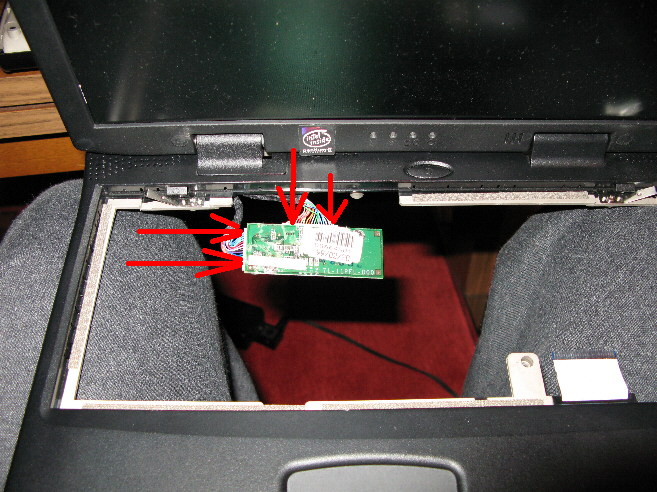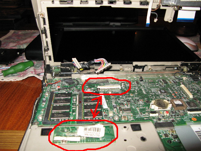 Schritt 11 : Oben sieht man nun die Platine welche das TFT-Display mit dem Rest des Notebooks verbindet. An der Platine sitzen zwei Stecker. Die Platine selbst ist mit zwei Schrauben befestigt und sitzt auf der Hauptplatine auf einem SMD-Sockel. Ich empfehle die beiden Schrauben ( grosse Pfeile links unten und rechts oben ) zu entfernen. Oftmals ( wie oben ) ist eine der beiden Schrauben durch den Aufkleber verdeckt ( ggf. den Aufkleber etwas entfernen ). Dann die Platine vorsichtig abheben und nun kann man die Stecker problemlos wie oben dargestellt abziehen.