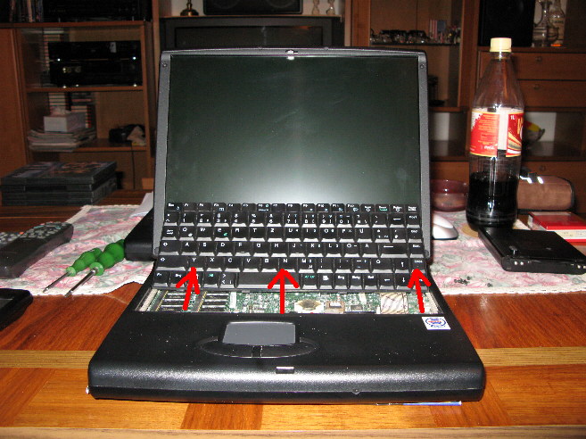 Schritt 1 :Als erstes die beiden Rasthaken ( oben im Bild mit roten Pfeilen markiert ) nach hinten schieben. Damit wird die Tastaur entriegelt ( springt nach oben ) und kann vorsichtig abgehoben/geklappt werden.