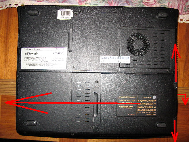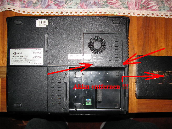 Schritt 4 : Nun das Notbook umdrehen. Als erstes den Akku entfernen. Wie das geht, sollte eigentlich geläufig sein. Aber hier nochmal im Detail: Die beiden Verriegungshaken in Pfeilrichtung auseinander ziehen und in diesem Zustand den Akku anschliessend abheben und irgendwo sicher deponieren ( am besten dort ,wo auch schon die Tastatur liegt...smile.... ).