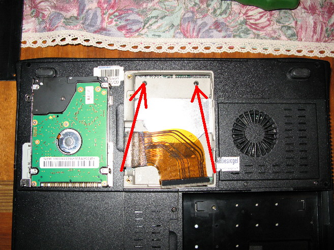 Schritt 7 : Auf dem Bild oben sieht man links die entfernte Festplatte und rechts daneben den Folienverbinder mit dem schwarzen Stecker. Nun die beiden mit dem Pfeil markierten Gehäuseschrauben entfernen ! Keine Angst, das sind die letzten Schrauben, welche wir in unseren Schraubenhaufen legen müssen ;-)