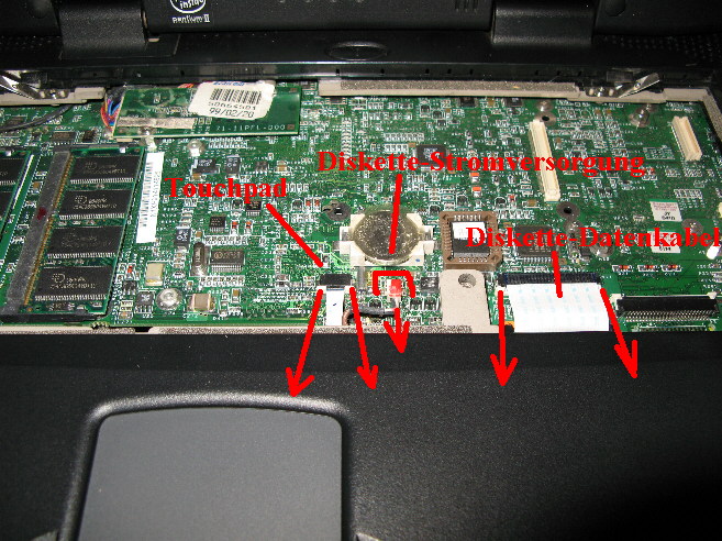 Schritt 9 : Nun müssen wir das Touchpad; die Diketten-Laufwerks Stromversorgung und das Disketten-Datenkabel entfernen. Das Touchpad und das Disketten-Datenkabel stecken in Sockeln ähnlich denen der Tastatur. Hier muss man die SMD-Buchse nur entriegeln und die weissen "Nasen" ca. 1mm in Pfeilrichtung ziehen damit die Flachbandkabel freigegeben werden und sich aus den Sockeln mühelos herausziehen lassen. Die Stromversorgung für das Diskettenlaufwerk ( 2 Poliges Kabel ); steckt in einer kleinen schwarzen Buchse. Einfach am Kabel anpacken und vorsichtig in Pfeilrichtung ziehen. Es macht "klack" und schon ist auch dieses Kabel frei.