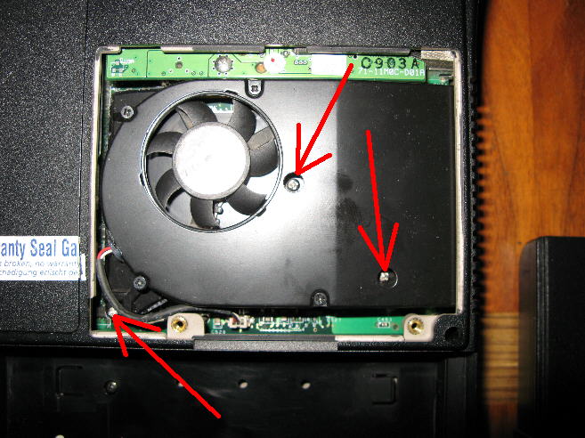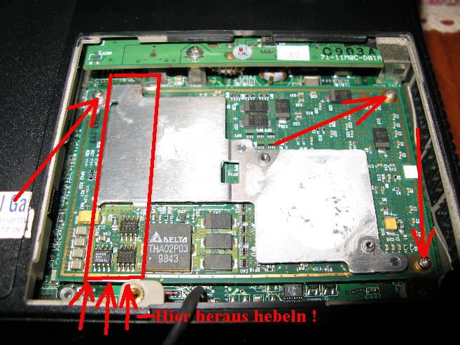 Schritt 3 : Oben sieht man nun den freigelegten Prozessorlüfter. Dieser wird nur mittels dreier Schrauben auf dem Prozessor gehalten. Um diesen zu entfernen, einfach die drei mit roten Pfeilen markierten Schrauben entfernen. Danach kann man den Lüfter abheben und nach unten hin um 90 Grad wegdrehen ( man muss die Stromerbindung nicht trennen !!! ), sodass die MMC2 Prozessor-Platine frei zugänglich ist.