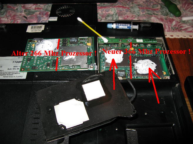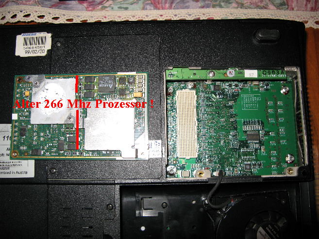 Schritt 1 : Wie oben gut zu erkennen wird der langsame 266 Mhz Prozessor angezeigt. Der funktioniert zwar auch unter Windows XP, aber viel Spass macht das ganze nicht wirklich. Es muss also ein schnellerer Prozessor her. Hierzu bieten sich die 366 Mhz Prozessoren aus den 366 Mhz Prozessoren aus den Network Avantgarde 366 MP Modellen ( bei Gericom auch Masterpiece genannt ) an, so man ein solches Modell irgendwo auftreiben kann. Aber man bekommt die auch als MMC2 Version bei Händlern ( aber teuer, da die schon lange nicht mehr gebaut werden ! ) gebraucht. Ferner fällt auch auf das der Hauptspeicher mit 64MB nicht wirklich ausreicht, gerade wenn man Windows XP im Einsatz haben möchte. Also einfach einen weiteren 64 MB Riegel nachrüsten ( wie das geht steht weiter oben, resp. auch auch meiner 1100AT Tuning-Page ), sodass man min. 128 MB Hauptspeicher hat. Man kann aber auch einen 128 MB Riegel oder gar 256 MB Riegel einstecken. Die Architektur des verbauten BX-Chipsatzes in den 1100P und Avantgarde-Laptops macht das hochrüsten zum Glück zu einem Kinderspiel. Aber nun zum Prozessor-Upgrade:
