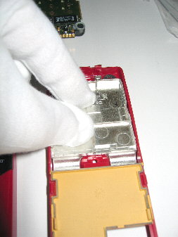 vorsichtig vom Backcover entfernen ( auf die unteren Kontaktreihe mit der
