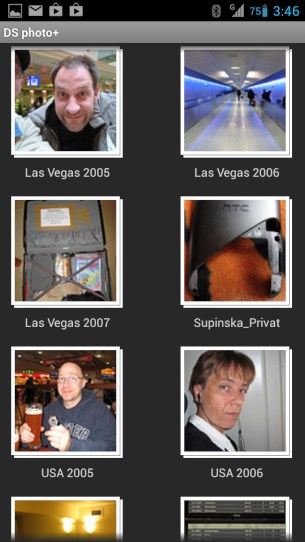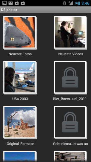 Nochmal der Hinweis: Die BILDER werden immer in Original-Auflösung übertragen und auf dem Server abgespeichert. Man stellt also auch mit der Photo-Station sicher, dass ein 1:1 Backup der Bilder aus den USA durchgeführt wird. In der Photo-Station selbst ist es nur möglich die Bilder verkleinert anzuschauen. Die Originale bekommt man niemals ausgegeben (denn diese Funktkion habe ich dort gesperrt). Niemand ausser Personen welche das Ordnerpasswort kennen, haben Zugriff auf Deine Bilder. Alles ist sicher und funktioniert so gut wie ein FTP-Upload. Nur hier hat man den Vorteil, dass alles sehr einfach funktioniert und die Übertragung beim HTTPS-Zugang sogar verschlüsselt abläuft. Kommen wir nun zur Variante wie man z.B. Bilder seines Android (oder Apple Iphone) Smartphones und dessen Kamera auch auf die Photo-Station auslagert und sichert. Hierzu geht man bei Android-Smartphones in GooglePlay und installiert sich die kostenlose App "DS Photo+" von Synology Inc. Nach der Installation kann es auch schon mit dem Backups der Smartphone-Bilder losgehen. Das funktioniert wie folgt: