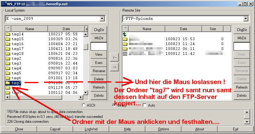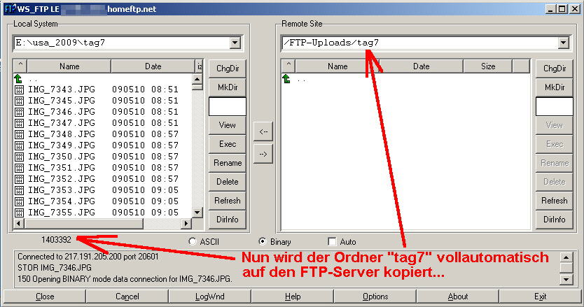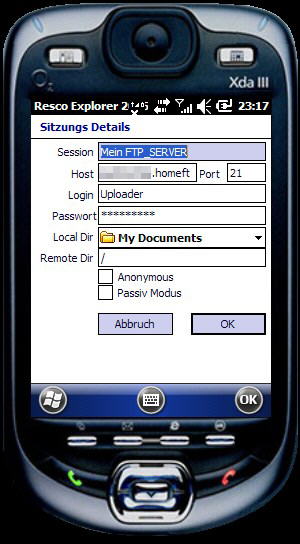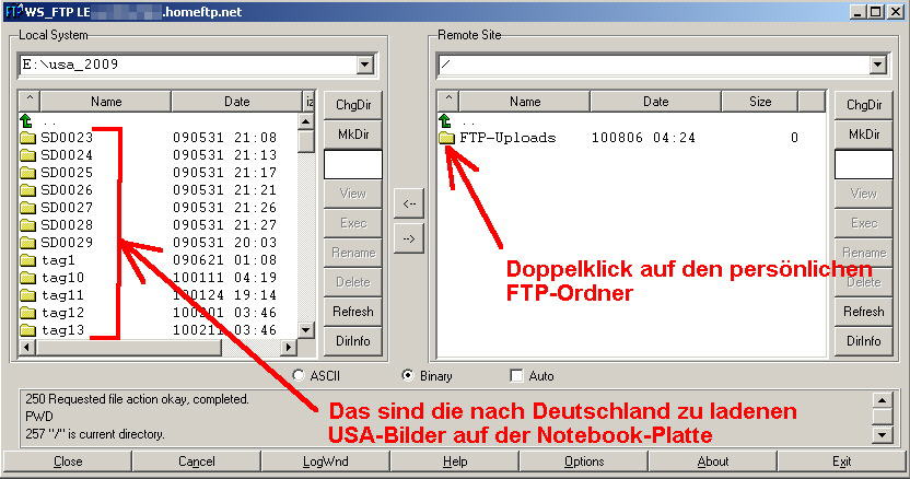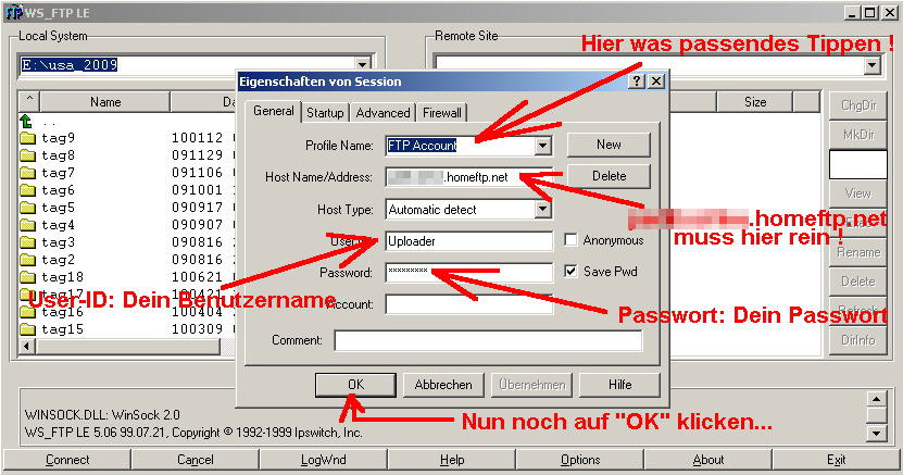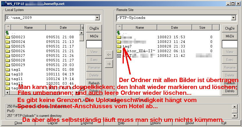 FTP-Server Zugang ?: Jeder bessere Browser verfügt mittlerweile über ein eingebauten FTP-Clienten. Da ich hier nicht auf die Vielzahl an Browsern und FTP-Clienten eingehen kann und mag, beschreibe ich nun die Vorgehensweise und Nutzung des FTP-Servers mittels eines kleinen einfachen FTP-Clienten "WS-FTP95" aber auch einem Windows-Smartphone. Denn ich selbst habe zum Beispiel auch 2010 mit meinem XDA-III Smartphone die mit der Handy-Kamera geschossenen Bilder aber auch MP3 Sprachhinweise (aus denen ich übrigens meine Reisetagebücher so dertailiert nachträglich rekonstruieren kann) aus den USA nach Deutschland kopiert. Und so funktionert es: Nach der Identifikation erhält man von mir per Briefpost ein einfach zu merkenden Link samt der nötigen Zugangsdaten inkl. Benutzernamen & Passwort für den FTP und Photo-Station Zugang: