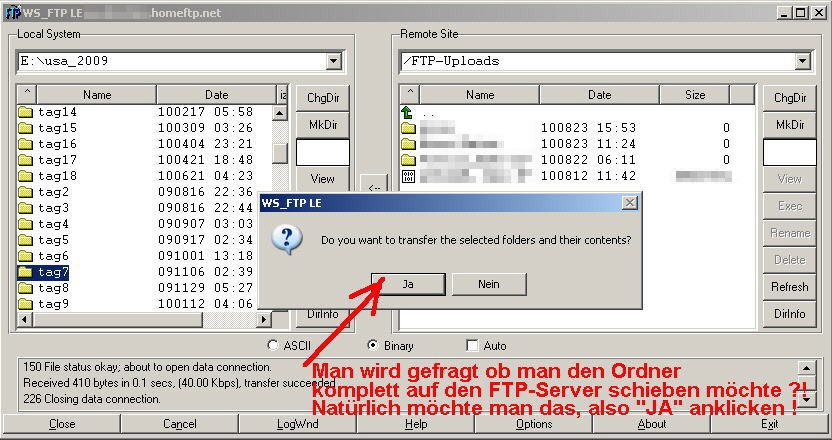 per Post übermittelten Namen ersetzt werden) Registrierte Nutzer werden natürlich einen eigene personalisierten Ordner und Zugang erhalten auf den nur Sie lesend; schreibend und löschend zugreifen können. Hier nun die obige Konfiguration in 6 selbsterklärenden Bildern mit einem ganz einfachen FTP-Client Programmes ( zum Download <<<hier klicken>>> ) unter dem Betiebssystem Windows. Natürlich kann man auch moderne FTP-ClientProgramme nutzen und selbstverständlich ist es auch möglich eine gesicherte SFTP-Verbindung über den Port 22 zum Server herzustellen: