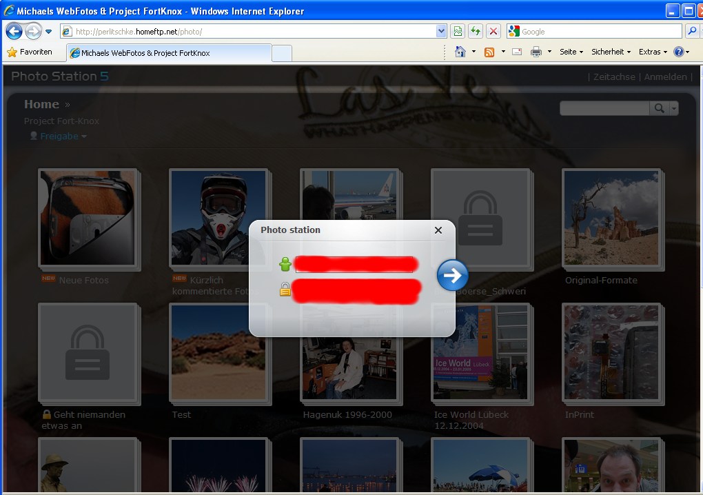 Hinweis: Der Server besitzt eine Bandbreite (das gilt auch für FTP-Uploads) von ca. 800kb/s. D.h. man kann Daten mit dieser Geschwindigkeit in den Server ( Photo-Station oder mittels FTP ) pumpen. Ideal für schnelle Backups, so man in den USA die entsprechende Bandbreite zur Verfügung gestellt bekommt. Ausgehend -also vom Server ins Internet- ist die Bandbreite stark reglementiert. Allerdings immer noch so schnell das man sich auf der Photo-Station Bilder anschauen kann. Jedes hochgeladene Bild wird von der Photo-Station umfassend einem sogenannten Medienindizierungsdienst unterworfen. Das heisst von jedem Original-Foto werden unzählige kleine Miniaturansichten erzeugt was sehr viel Zeit benötigt und für den Server sehr rechenintensiv ist. Was heisst das nun praktisch? Antwort: Sobald man viele Bilder hochgeladen hat, werden diese einzeln vomServer bearbeitet ( Hinweis: Die hochgeladenen Original-Fotos werden NICHT verändert, diese stellen nur die Basis dar...) und für jedes Bild Unmengen kleiner Miniaturbilder erzeugt. Also stehen einem die Bilder zum anschauen erst nach der Server-Verarbeitung etwas später komplett zum anschauen in der Photo-Station zur Verfügung. Also bitte nicht wundern, wenn die direkt nach dem Upload noch als "in Bearbeitung" gekennzeichnet vorliegen. Und so funktioniert das Bilder-Backup aus den USA mittels PC. Man startet seinen Web-Browser und gibt dort folgenden Photo-Station Links ein: