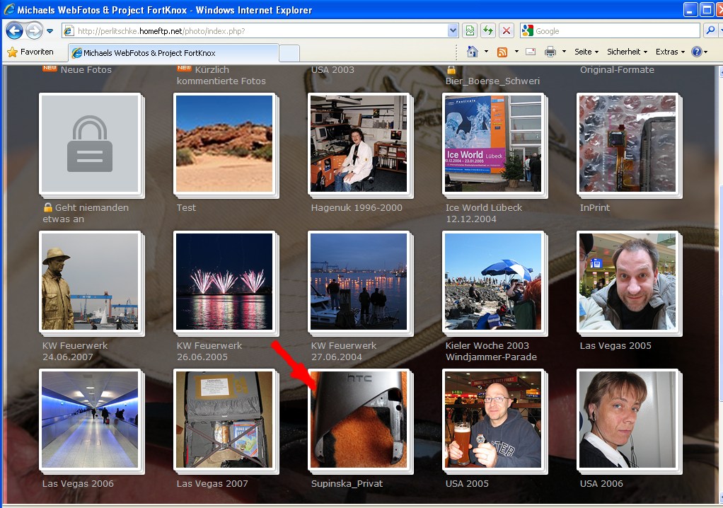 Nachdem Du Dich eingeloggt hast, wird Dein persönlicher Ordner sichtbar. Auf diesen Ordnernamen ( das ist Deiner !!! ) klicken um in selbigen zu verzweigen. WICHTIGER HINWEIS: GÄSTE bekommen Deinen Ordner auch angezeigt, allerdings besitzt dieser ein grosses graues Schloss. Wer von Deinen Freunden das "Ordnerpasswort" kennt, kann es dort eintippen und lesend auf Deinen Bilderordner zugreifen und sich alle schon von Dir übertragenen Fotos anschauen. Das ist besonders praktisch um zum Beispiel Deinen besten Freunden oder der daheim gebliebenen Familie Deine schon übertragenen Fotos zugänglich zu machen, noch wärend Du noch in den USA unterwegs bist. Fotos können natürlich NICHT in Originalgrosse runtergeladen oder irgendwie übertragen werden. Genauso ist die Alben-Download-Funktion komplett gesperrt, sodass Deine Original-Fotos so sicher wie das Gold in FORT KNOX liegen...