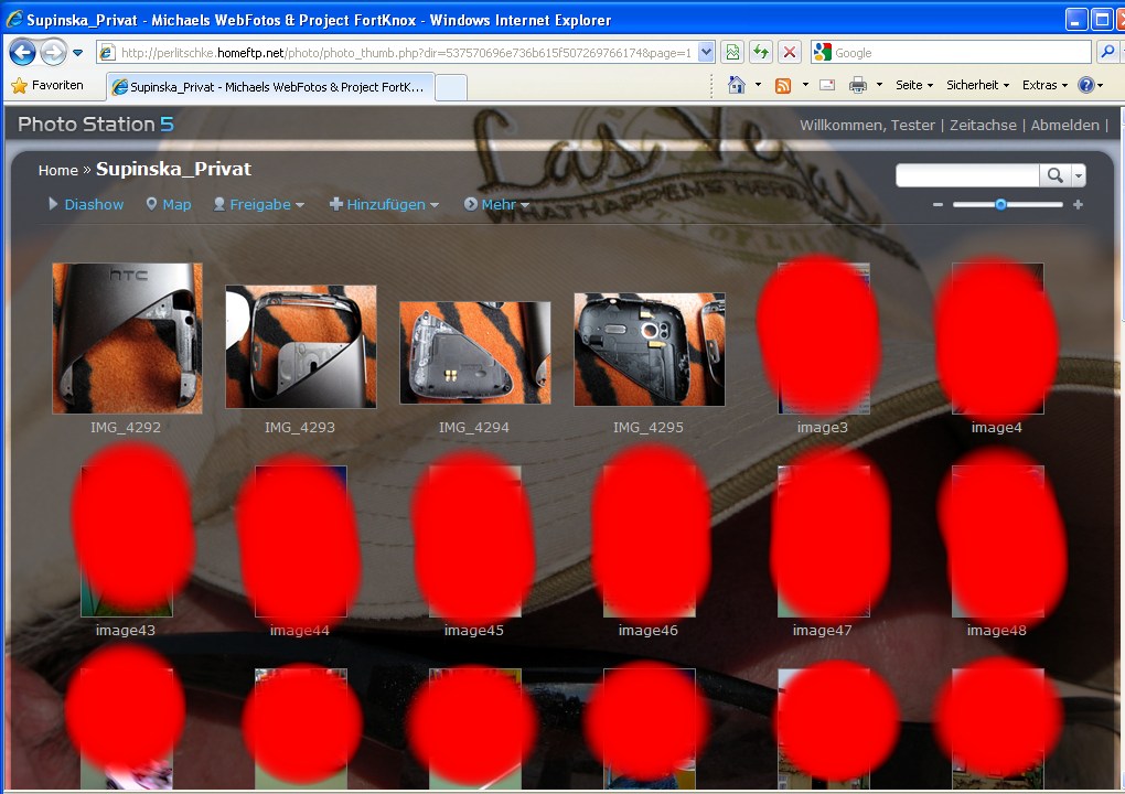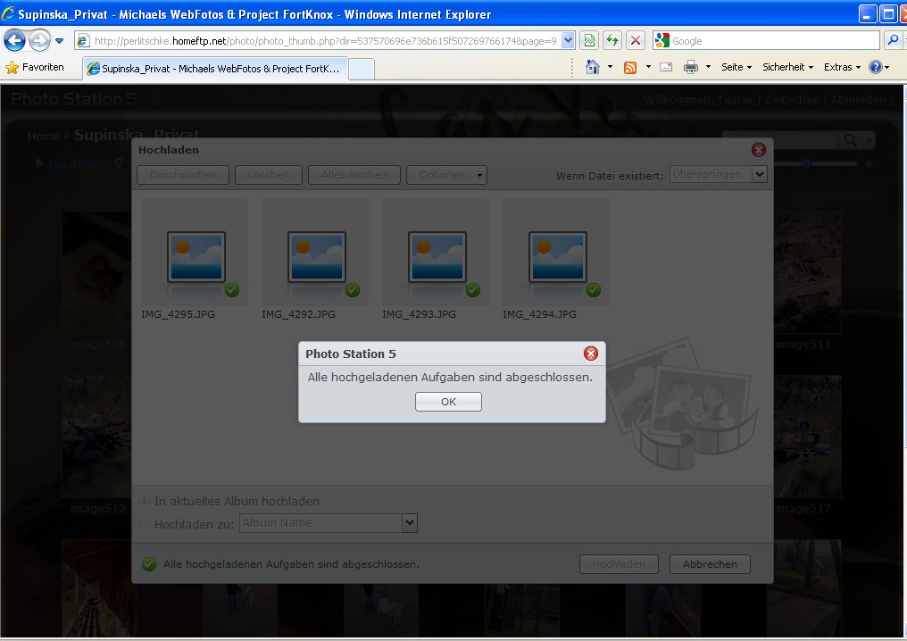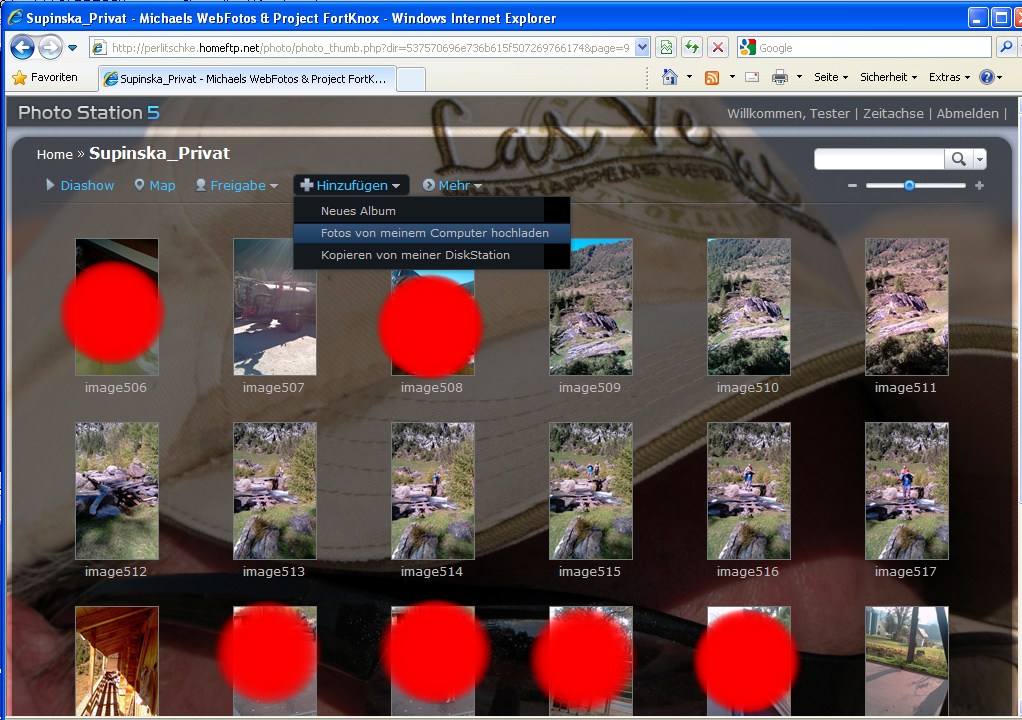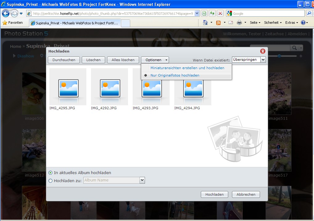 Smartphone?: Neben der FTP-Upload Option biete ich noch den Upload der Bilder mittels Photo-Station an. Beide Zugänge sind unabhänigig mittels zwei individueller Zugangsberechtigungen für Uploads nutzbar. Der Passwortgeschützte Zugang zum Photo-Station Backup-Upload Archiv hat allerdings den Vorteil, dass man die Bilder seinen Freunden und Familie noch in den USA zeigen kann und die Übertragung verschlüsselt abläuft. Diese können sofern diese im Besitz des Links und speziellen Kennwortes sind, alle Bilder anschauen, allerdings keine Original-Fotos runterladen. Nur das Anschauen ist für Freunde und/oder die Familie möglich. Als registrierter Nutzer mit einem echten Account kann man Bilder Ordner anlegen ( z.B. "TAG1"; "TAG2" etc.p.p. ); bequem Uploads mittels Internet-Explorer per HTTPS durchführen ( Drag & Drop geht natürlich auch ) aber auch mittels Android; Iphone; Windows Phone APP Uploads vom Smartphone und dessen Bilder realisieren.
