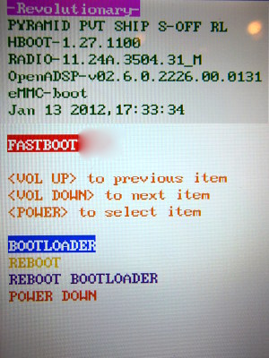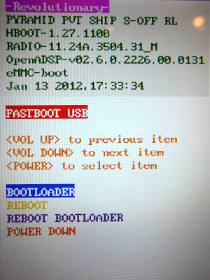 Bevor es weiter geht müssen wir unser HTC-Sensation zum flashen vorbereiten, also ausschalten und in den Bootloader-Modus starten. Das kennen wir ja schon. VOL-DOWN drücken und gedrückt halten und einmal die EIN/AUS-Taste drücken. Dann im Bootloader-Modus nochmal die EIN-AUS Taste um den den Fastboot-Modus mit dem roten "FASTBOOT" zu kommen und wenn man nun ein USB-Kabel anschliesst wechselt "FASTBOOT" auf "FASTBOOT USB". Hier die Schritte in Bildern: