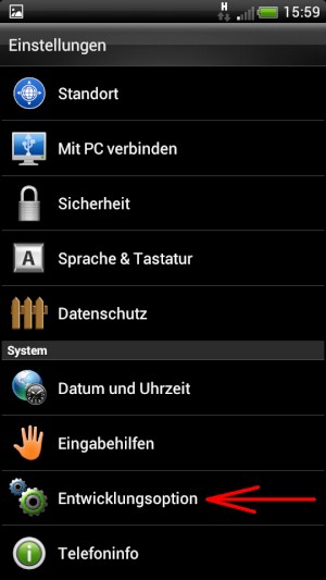 Nun verzweigst Du in die "Einstellungen/Entwicklungseinstellungen". Hier werden wir nun folgende Optionen aktivieren: