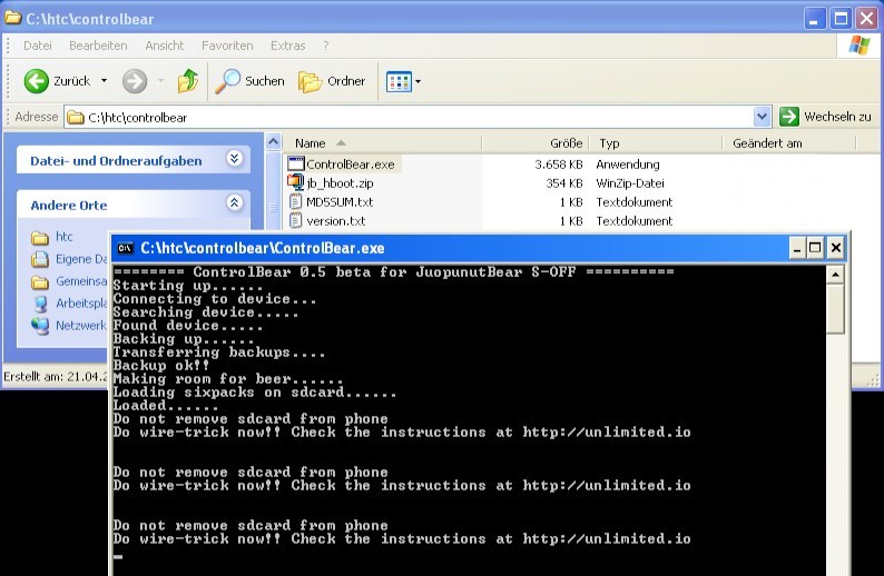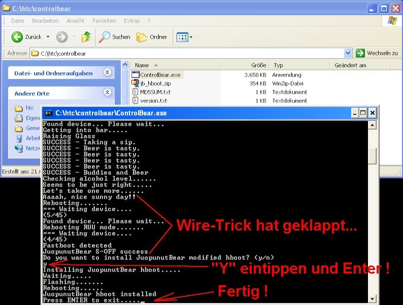 Sollte obiges passieren, also Dein erster Kabel-Trick Versuch ein kompletter Reinfall gewesen sein, entferne kurzerhand den Akku aus dem HTC Sensation, beende am PC "ControlBear", starte das Sensation neu, bis es vollständig (resp. soweit es möglich ist) hochgefahren ist und starte "ControlBear.exe" erneut. Irgendwann wird es mit dem Wire-Trick 100%ig klappen, also Hartnäckigkeit zahlt sich wie immer positiv aus. Sollte der "ControlBear" fröhlich weiterarbeiten, wirst und du noch gefragt, ob du "JuoponutBear-HBOOT" installieren willst. Selbstverständlich willst Du das, somit einfach mit einem "Y"es antworten und warte bis wirklich nichts mehr passiert. Das ganze sieht dann im Bild auf dem PC so aus:
