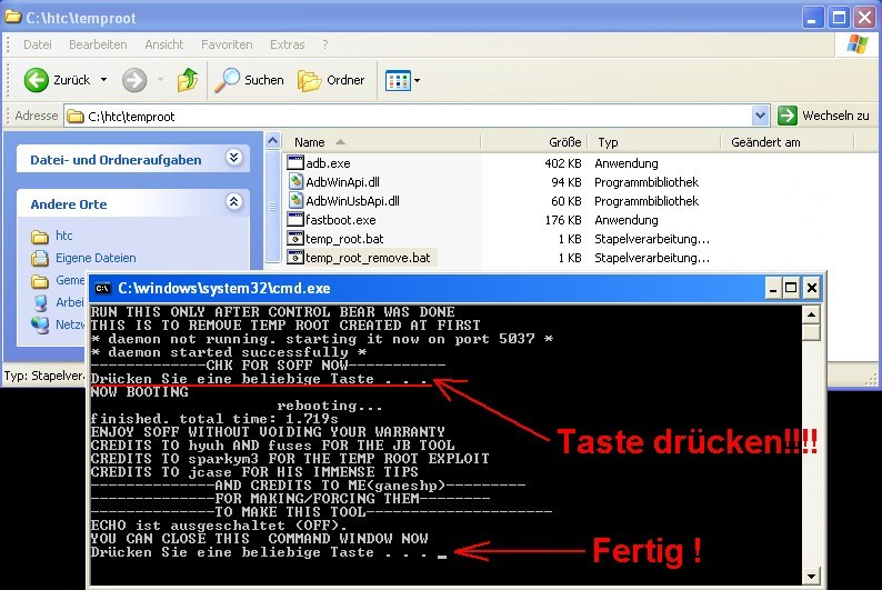 Solltest Du obiges Bild sehen entfernst Du Deinen HTC Akku aus dem Sensation und fährst das HTC Sensation vollständig hoch um dann im Ordner "temproot" die Datei "temp_root_remove.bat" auszuführen. Das sieht auf dem PC dann wie folgt aus: