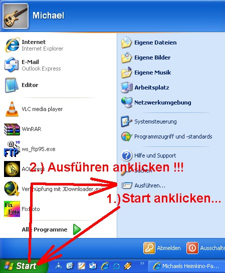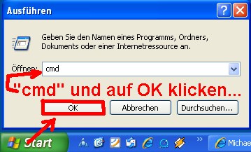 Schritt 4 ( Setzen der SUPER-CID ): Eine CID forced/begrenzt das HTC Sensation auf die HTC Stock-ROMs div. Provider. Zum Beispiel besitzt ein Telekom Sensation die CID "T-MOB101" und ein Vodafone-Sensation zum Beispiel die "VODAP102". Somit wird effektiv verhindert das ein Telekom-Sensation ein Vodafone ROM und umgekehrt flashen und benutzen kann. Wenn du irgendwann also mal weitere "PG58IMG.zip"s flashen willst oder eine RUU Deines Providers zurück installieren möchtest, um z.B. wieder S-ON zu kommen und die Garantie zu besitzen, dann ist eine SuperCID von elementaren Vorteil. Um wirklich alles wieder flashen zu köennen hat HTC die sogenannte SuperCID eingeführt. Sie lautet "11111111" (8mal die 1) und ersetzt alle bekannten CIDs, sodass alles was man flashen möchte auch als legitim erkannt wird und natürlich geflasht werden kann. Um diese SuperCID zu erhalten, steckst Du einfach Dein gebootetes HTC Sensation mittels USB-Kabel an Deinen PC. Jetzt kommen die beiden beiden Dateien "adb.exe" & "fastboot.exe" im Ordner "htc" ins Spiel. Diese können jedoch nicht wie normale Windows-Programme durch einen Doppelklick gestartet werden, denn um diese Programme effektiv und Zielgerichtet benutzen zu können, müssen diese im "CMD-Befehlszeilenprogramm" Modus genutzt werden. Jedem DOS-User (oder den alten Säcken wie ich auch einer bin) wird das geläufig sein. Also um sie zu öffnen, klicke unter Windows XP unten links auf den Start-Button und klicke dort rechts auf den Button "Ausführen". In der nun erscheinenden Zeile tippst Du die drei Buchstaben "cmd" ein. Es erscheint ein DOS-Fenster mit einer Pfandangabe wie zum Beispiel "c:\Dokumente und Einstellungen\Michael>"... Hier mal wieder zum praktischen nachmachen obiges inform von Bildern (denn die sagen bekanntlich mehr als 1000 hingesülzte Jedi-Worte):