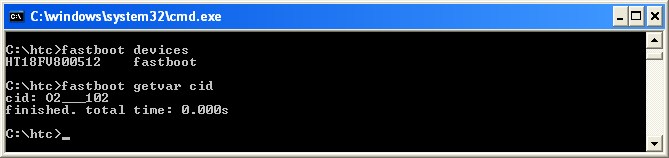Jetzt checken wir erstmal unsere CID-Kennung unseres Sensations. Hierzu tippe im CMD-Fesnter folgenden Befehl ein: