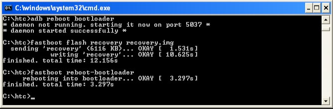================= Jetzt startet das Sensation erneut in den Bootloader, sodass wir nun das "4EXT-Recovery" (wird zum flashen der Root-Rechte benötigt, also der auf der SD-Karte liegenden "givermeroot.zip") flashen können. Dazu befindet sich sinnigerweise im Ordner "htc" eine Datei namens "recovery.img". Um dieses nun flashen zu können, geben wir jetzt ( Sensation befindet sich im Bootloader-Modus ) folgendes in unser Kommandozeilenfenster ein: