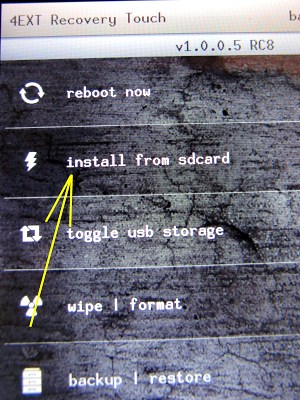 Jetzt verzweigen wir auf den Menüpunkt "Install zip from sdcard" und anschliessend auf "choose zip from SD-Card". An dieser Stelle suchen wir uns die Datei "givemeroot.zip" aus um diese dann zu selektieren und nach einem Warnhinweis zu flashen. Nachdem die "givemerooot.zip" geflasht wurde, drücken wir unten am Sensation auf den "Zurück-Button" und erreichen wieder das Hauptmenue des 4EXT-Recovery. Dort ganz oben auf "reboot system now" klicken resp. diesen Menüpunkt aktivieren und das HTC Sensation wird ganz normal neu starten.