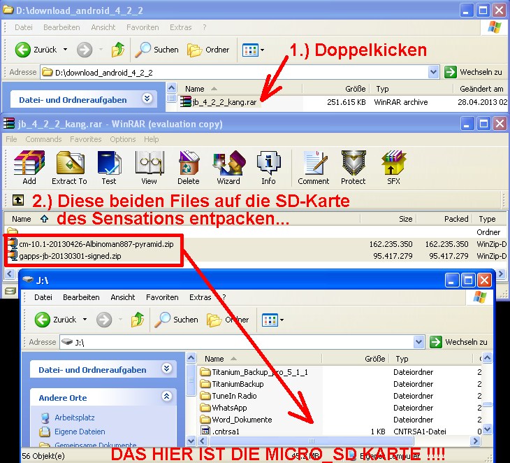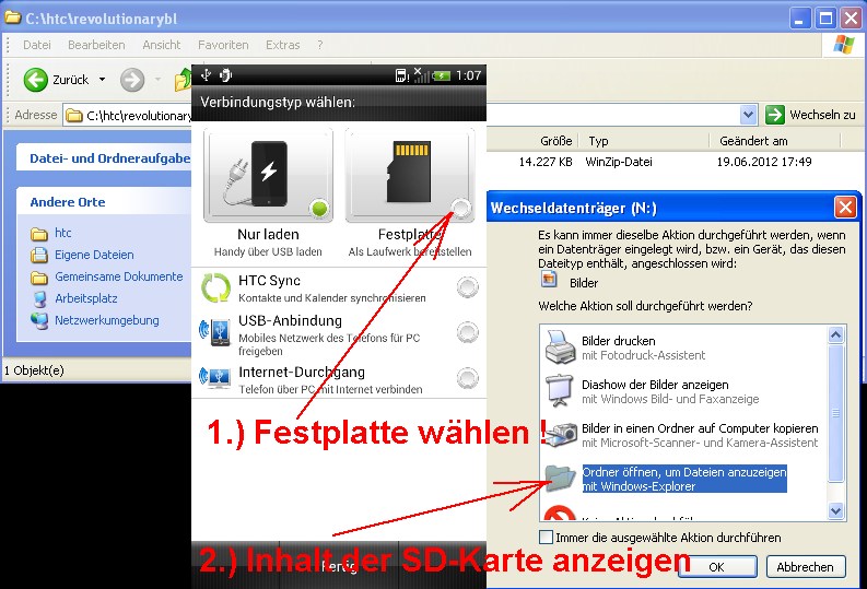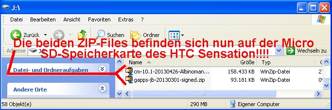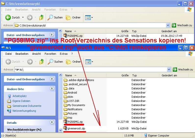 Nun wartest Du einen kleinen Moment und das HTC Sensation und dessen Android 4.0.3 wird wieder ganz normal funktionieren und mit dem noch vorhandenen ICS 4.03 Stock-ROM vollständig benutzbar sein. Nun hast Du also den "JuoponutBear-Bootloader" installiert. Da allerdings der Revolutionary-Bootloader bei den meisten HTC Sensations genutzt wird, sollte man den installierten "JuoponutBear-Bootloader"durch den " Revolutionary-Bootloader" ersetzen, also diesen benutzen. Um dieses Ansinnen zu erreichen, schliesse hierzu das HTC Sensation wieder an Deinen Windows-PC an. Im Ordner "htc/revolutionarybl" findest du ein ZIP-Archiv namens "PG58IMG.zip", welches so wie es ist auf die SD-Karte ( dort ins Root-Verzeichnis kopieren und nicht (!) rein in einen SD-Karten Ordner ) Deines Sensation zu kopieren ist. Und da Du schon am kopieren bist, kopiere bitte auch gleich die Datei "givemeroot.zip" ebenfalls ( nicht entpacken, auch so belassen wie diese ist!!!!) auf die SD-Speicherkarte Deines HTC Sensation, denn diese wird in kürze auch noch benötigt. Das sieht dann so aus: