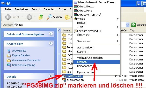 Warum müssen wir die Datei "PG58IMG.zip" wieder löschen? Die Antwort ist sehr simpel: Sobald wir zukünfig in den Revolutionary-Bootloader einsteigen, wird das Sensation solange diese "PG58IMG.zip" auf der SD-Karte entdeckt wird versuchen diese wieder und wieder zu flashen und da wir diese ja schon frisch geflasht haben, muss diese von der SD-Karte natürlich wieder entfernt werden. Sonst würde man sich ewig im Kreis drehen, wenn man diese Datei resp. den neuen Bootloader nicht von der SD-Karte entfernt. Wichtiger Hinweis: Die zweite Datei also die "givemeroot.zip" bleibt jedoch weiterhin auf der SD-Karte, denn diese wird später noch benötigt...also nur die "PG58IMG.zip" aus dem SD-Karten Root-Verzeichnis in die sprichwörtliche Tonne für den Abfall der dunklen Seite der Macht treten. Wer mag kann mit einem Jedi-Schwert noch rauf herumstochern und jedes einzelne Bit atomisieren... Hier ein Bild von dieser oben beschriebenen Löschaktion: