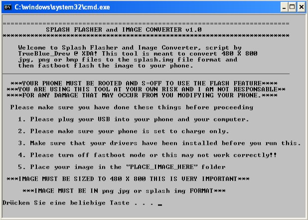 Das war´s dann auch schon mit dem flashen eines neuen Splash-Screens. Dieser bleibt dauerhaft erhalten, bis man einen neuen SplashScreen in obiger Vorgehensweise flasht. Mit der Software kann man sich auch seine eigenen Splash-Screens flashfertig konvertieren (ich habe das mit dem Mädel als fertiges Beispiel hiermit schon vorgestellt). Bitte denkt dran, dass die Bild-Auflösung der verwendeten Bilder der nativen LCD-Auflösung unseres HTC-Sensation entsprechen müssen, also 540*960 Pixeln bei einer Farbtiefe von 24Bit.