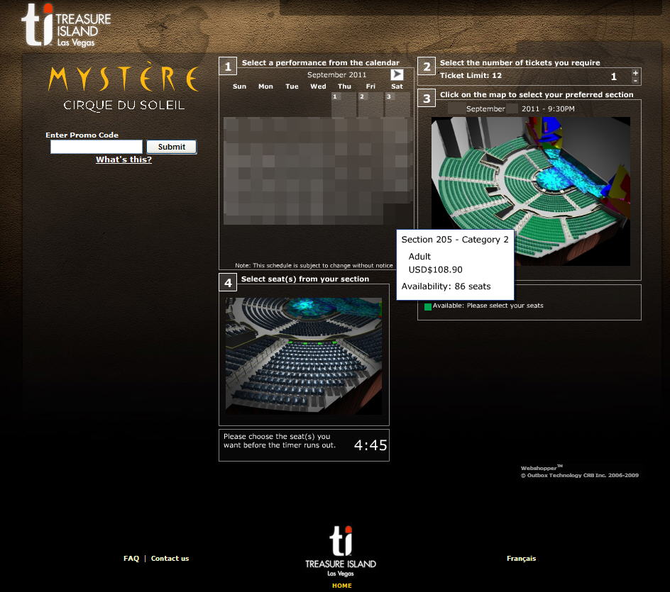 keiner Tipp, habe gerade Cirque Du Soleil -Mystere- im TI zur Summer 50US$ Promo geschossen. Inkl. aller Gebuehren ( Show-Tax und E-Ticket ) nur 63US$ (resp. 45 Euro). Das interessante ist aber, das der identische Sitz-Platz ueber die regulaere TI-Website gebucht 108.90 US$ ( mit Steuern und E-Ticket 122, 85 US$ ) kosten wuerde.