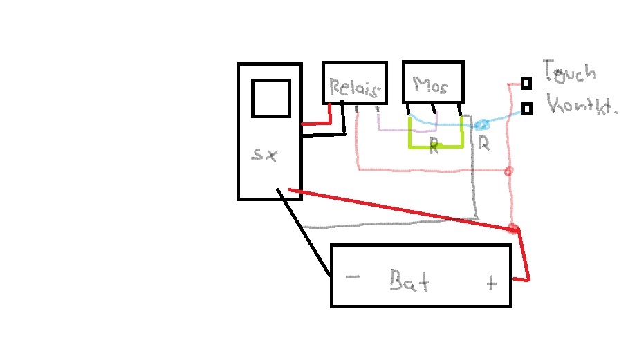 Ich müsste also wissen ob der SX in der Lage ist den erforderlichen Strom über den Schaltkontakt zu liefern, und ob er das überhaupt ab kann wenn man einen Verbraucher in die Schaltleitung hängt. Denn der Mosfet dürfte ja etwas Strom verbrauchen um überhaupt schalten zu können. Die Schaltung (sx) ist vermutlich aber nicht darauf ausgelegt, oder? Bzw gibt es einen anderen Weg den Mosfet zu Speisen bspw über entsprechende Widerstände direkt aus der Batterie?