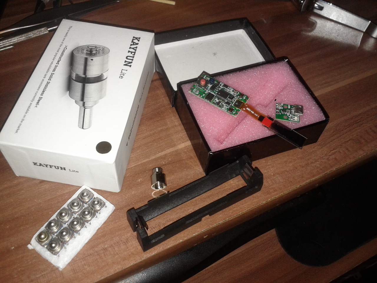 pappbox um das grund ger??st herzustellen, wir machen jetzt mal recycling, box aus metal oder holz hat ja jederwir machen unsere so klein und handlich wie m??glich, modchip, 510er verl??ngerung bzw anschluss, taster (aus polen ebay 42 zlotty), batterie halter von reichelt, hab auch noch lose zum l??ten aber die benutzen wir erst bei der richtigen box mit dem orginal dna board =)