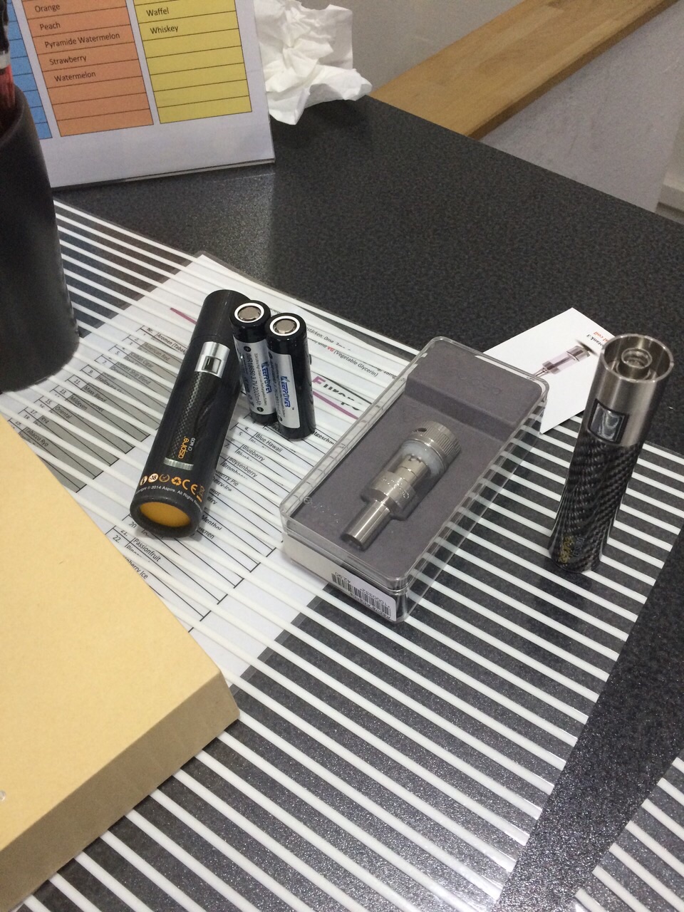Heute Nachmittag erhalte ich ein Foto von seiner Ausbeute und ich muss echt sagen ich war geschockt. Die haben ihm ohne Hinweis oder Warnungen den Aspire Cf Mod und den Aspire Atlantis plus mir nicht bekannte Akkus und 50 ml 12 er Liquid nach Hause geschickt.