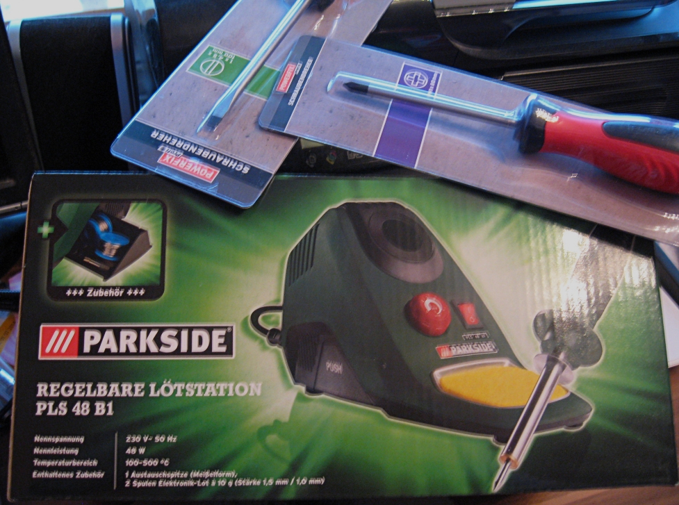 Dazu kam ein Helferlein fürs Löten von kleinen Teilen mit beleuchteter Lupe und Lötkolbenhalter (der wird wahrscheinlich nicht gebraucht?), hab ich um ca. fünf Euro vor Kurzem auch beim Lidl gekauft.