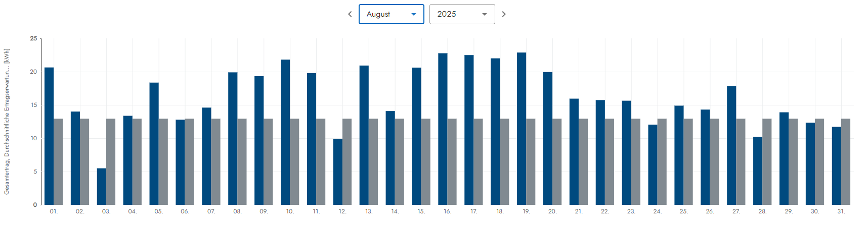 Wettersituation: Dieser viel zu trockene Mai war wirklich sehr schön, denn mit 20 Sonnentagen strahlte die zufrieden Sonne vom Himmel. Nur 9 Tage gab es einen Sonne-Wolkenmix resp. eine dünne Wolkendecke und 2 Tage hingen schwerere Wolververbände am Himnmelszelt. Alles in allem ein wirklich toller Mai, aber leider viel zu trocken da kaum Regen, denn die Natur braucht hin & wieder auch mal etwas Regen. Die Situation kann man sich wie folgt etwas genauer anschauen. Die grauen Balken sind die Ertragserwartung und die Blauen wieviel an Energie vom Himmel fiel: