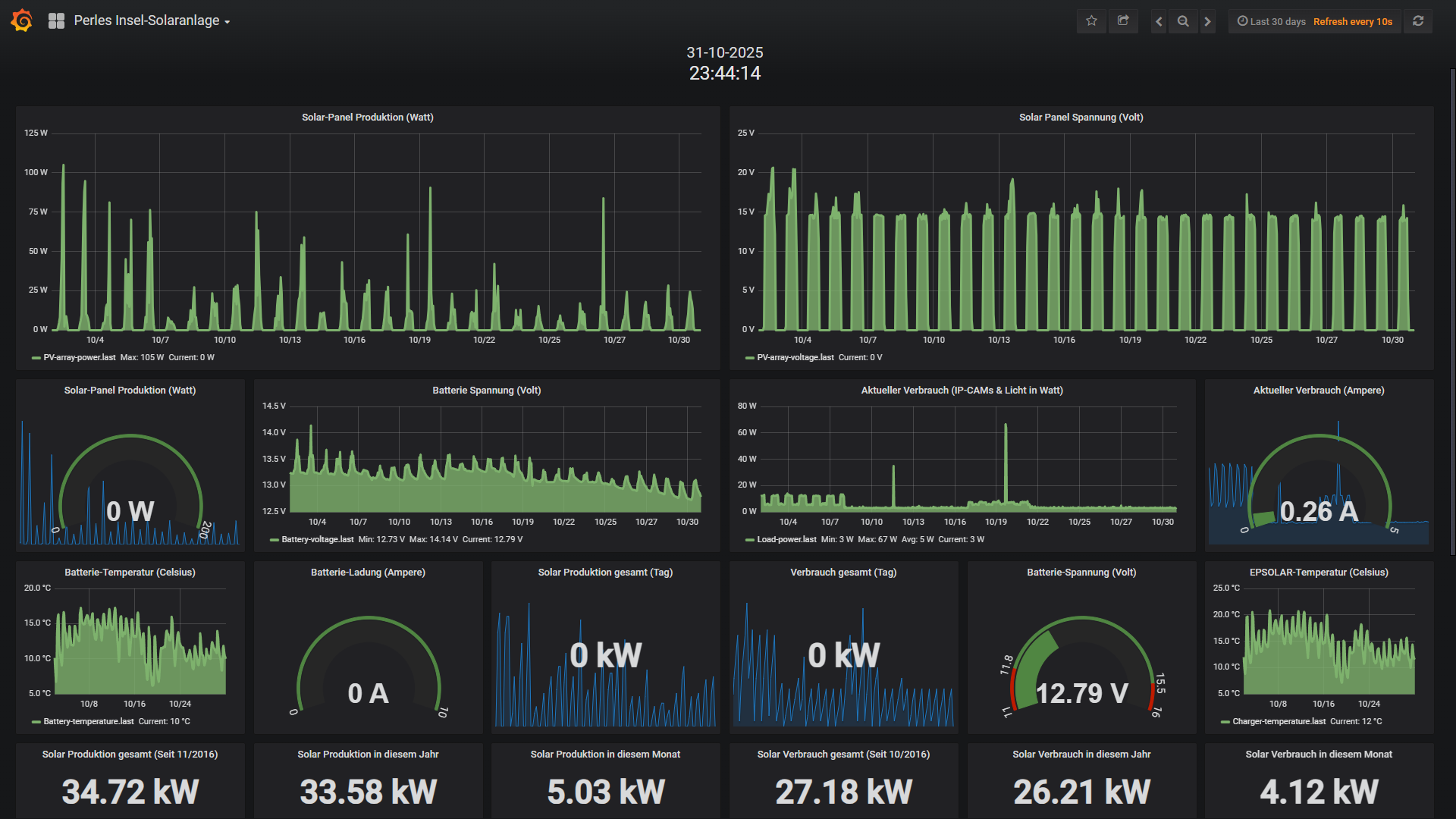 Die kleine 200 Watt Insel-Solaranlage: Der LiFePo4 100Ah Akku hatte in diesem düsteren Oktober hart zu kämpfen und musste von den Akku-Reserven zehren. Ab dem 09.10. musste ich sogar schon zu ersten Energiesparmassnahmen greifen und einige Systeme ferngesteuert abschalten. Mitte des Monats hatte sich Sparmassnahmen ausgezahlt, sodass wieder etwas Energie für eine Woche Normalbetrieb in den Akku kam. Am 22 Oktober musste wieder abgeschaltet werden, da der Akku sich erneut einer kritischen Marke näherte. Und das blieb so bis Ende des Monats. Erschwerend hinzu kommt auch das die von Tag zu Tag immer tiefer stehende Sonne (so die denn mal zu sehen war) die Panel nur noch kurz erreicht. Immerhin reichte die Energie um den Anthbot Rasenmähroboter 2mal mit Energie zu versorgen um den Rasen zu mähen! Wie schon die Jahre zuvor nähert sich die Inselanlage dem Winterschlaf. Noch funktionieren die elementaren Systeme wie das Daten-Logging, aber die Tage bis zur temporären Deaktivierung sind gezählt, sodass die Systeme dann im Winter immer nur bei Bedarf aktiviert werden. Hier sieht man gut was ich meine und das schlechte Wetter war zudem wenig hilfreich (gut im zweiten Bild ist zu erkennen wie die Systemspannung kontinuierlich abnimmt):