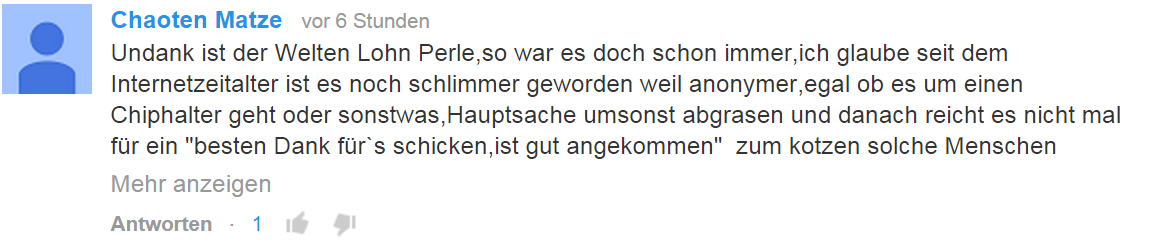 Das war jetzt echt mal eine Ansage,aber kann dich verstehen,hatte ja auch z.b.Bekanntmachung mit cpt.iglo2 hier im forum und da draussen ist es voll mit solchen Idioten,oder soll ich sagen dreckige drecks Körper, kann dich auch verstehen das du keine Verlosung mehr machst.MFG aus nms