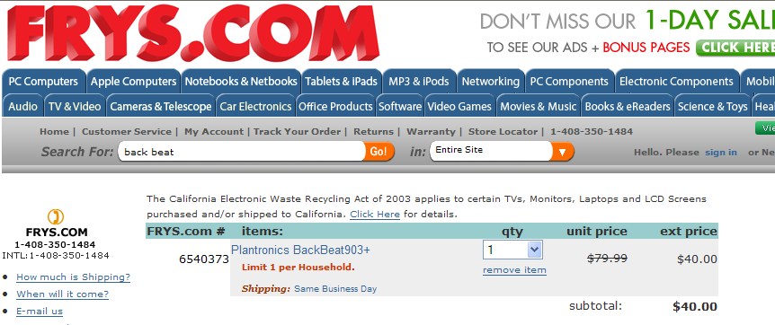 Das Plantronics BackBeat 903+ kostet 49,99 US$. Finde ich persoenlich etwas teuer, denn da kommen nochmal 8,1% Mehrwertsteuer ( Local Sales Tax ) an der Kasse hinzu und bei dem durchwachsen Euro-Wechselkurs ( heute 1,31161 ) lohnt das einfach nicht. Auch habe ich versucht dem Verkaeufer einen Rabatt aus den Rippen zu leiern...keine Chance...
