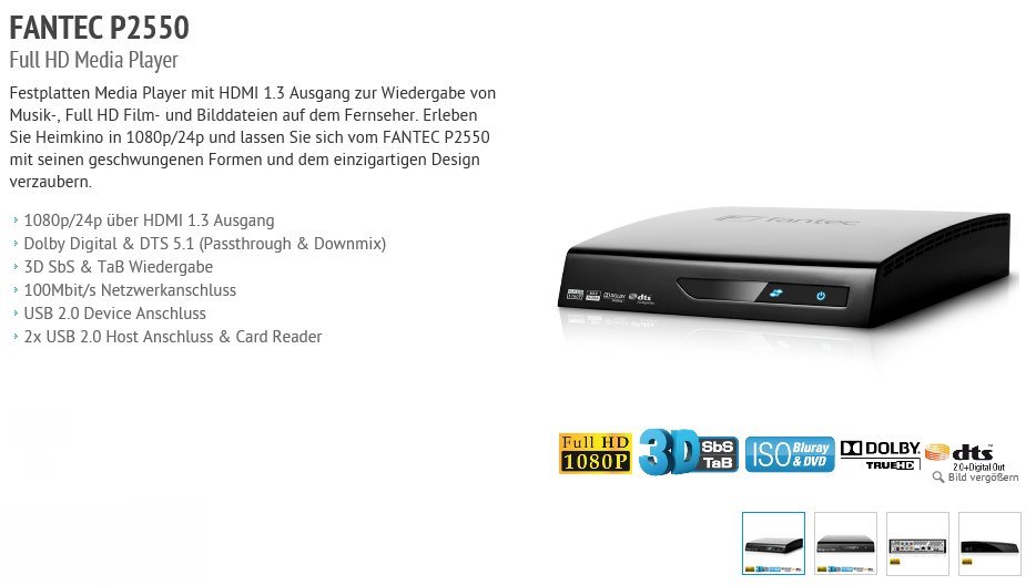 Der FANTEC P2550 ist ein FULL HD Media Player der das Heimkinoerlebnis grundlegend verändern wird. Nicht nur Standard Video-Dateien, sondern auch FULL HD Filme in H.264 lassen sich in bis zu 1080P abspielen (z.B. MKV, MOV oder AVCHD). Umfangreiche Anschlüsse wie HDMI, YPbPr, A/V, digitale Audioausgänge (inkl. Dolby Digital, Dolby True HD und DTS Downmix), 2x USB Host, 100Mbit LAN sowie 300Mbit WLAN ready USB-Stick Unterstützung machen den FANTEC P2550 zu einem wahren Multitalent. Der FANTEC P2550 ist mit seinem flachen und geschwungenen Design ein echtes Highlight im Wohnzimmer.