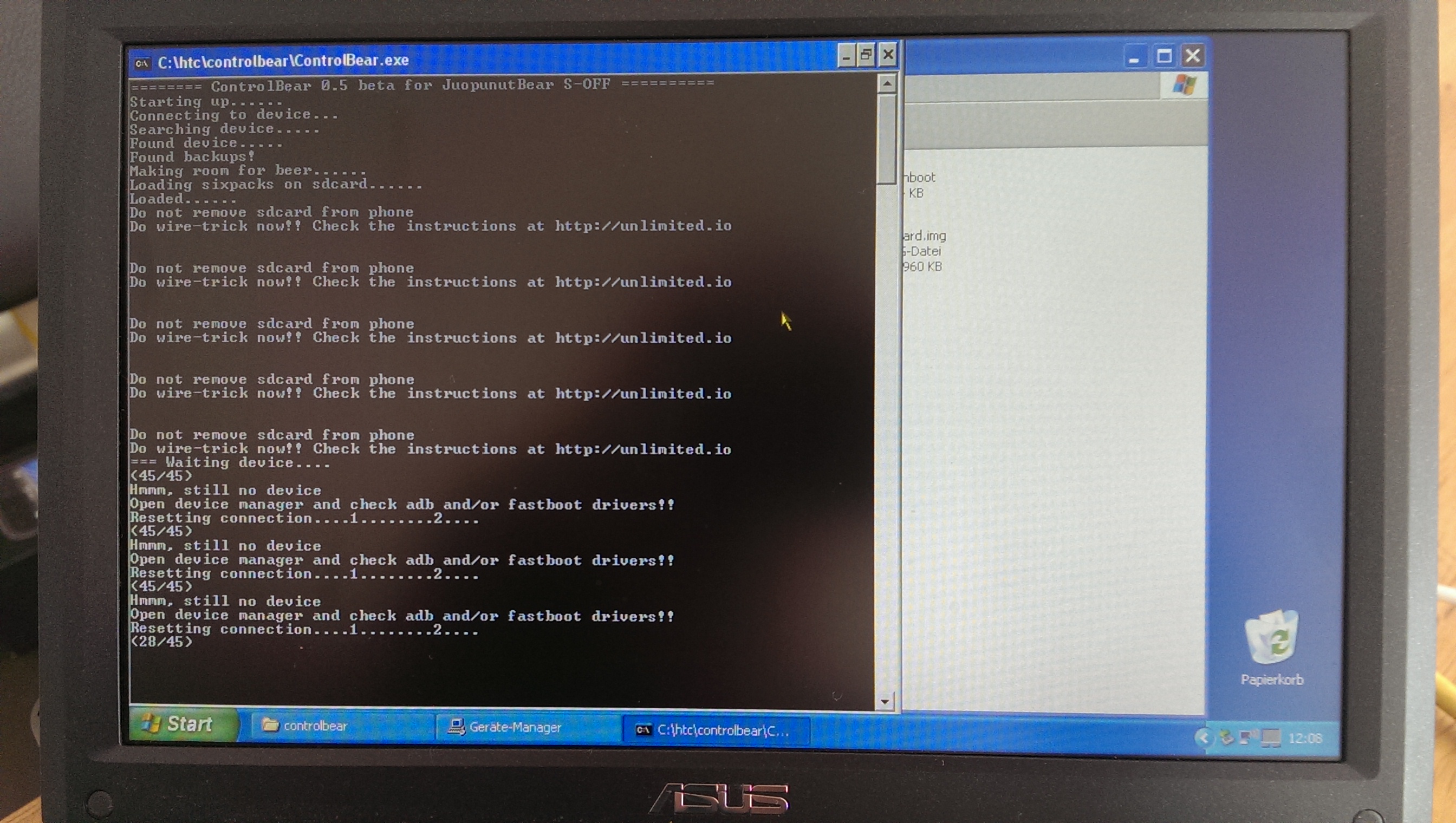 Hallo Michael,so sollte aber ADB stehen, denn so kann das mit dem EEE-PC nicht funktionieren. Was sind das denn fuer Treiber die Du da laufen hast ? Somit haben wir den Fehler wenigstens gefunden !!!