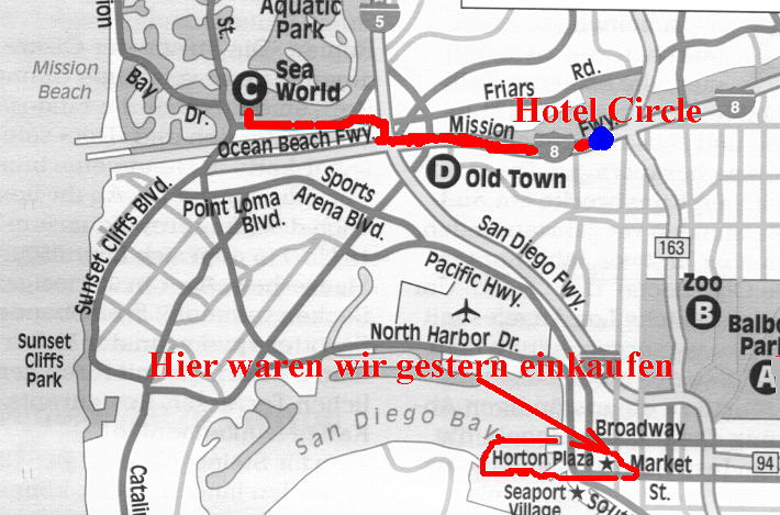 In unserem Hotel auf dem Dan Diego Hotel Circle, sind wir gegen 8:15