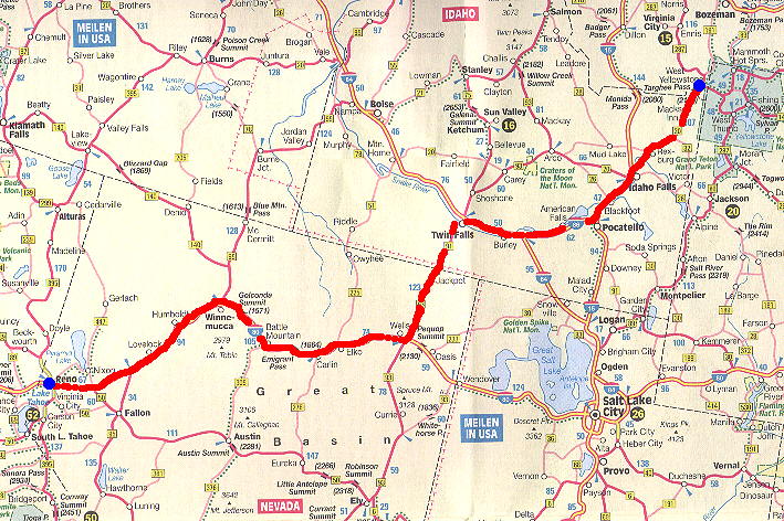 Auf den ersten 100 Kilometern Richtung Süden fuhren wir auf dem Highway 20 bis wir eine unbesetzte Tankstelle fanden, wo wir mittels E-Cash ( Kreditkarte ) unsere durstige Karre automatisiert bis zum Rand vollaufen liessen. Ca. 50km weiter machten wir einen Stop bei dem Thomas und ich uns mit einem guten starkten Kaffee in einer Truckerbude ausrüsteten um endlich so richtig Wach zu werden und Gas zu geben. Zwischenzeitlich ging auch die Sonne romantisch und Bilderbuchmässig auf und liess die morgendlichen nervigen Nebelschwaden langsam aber sicher verschwinden. Irgendwann begann dann kurz vor Pocatello der Interstate Highway 86, welchen wir nach ca. 200km fahrt dann bei Twin Falls ( hätten wir übrigens gerne besucht, hatten aber leider keine Zeit ) verliessen. Wir vertrauten uns demnach voll und ganz unserem soliden Naviations-Gerät an und folgten in südlicher Richtung ca. 180km den Highway 91, welcher uns nun -nachdem wir in Montana gestartet sind; über Idaho fuhren- bei Jackpod über die Staatsgrenze nach Nevada brachte. Auch hier machte sich nun wieder soetwas wie ein "Zuhausegefühl" breit. Komisch, aber so was das zu diesem Zeitpunkt, denn wir beide gehörten und passten auch irgendwie zu Nevada ;-) Nach einer scheinbar endlosen Fahrt kreuzten wir schliesslich den Interstate 80 Highway welcher uns dann nach vielen....vielen 100 Kilometern direkt nach Reno führen sollte. Wir fuhren fast ohne Pause durch, denn unser finales Ziel war es, noch vor Sonnenuntergang, in "Reno" zu sein und ein Zimmer gefunden zu haben. Und man mag es kaum glauben, das Yakumo GPS Navigations-System hat uns fast auf die Minute überpünktlich mit fast leeren Tank noch vor Sonnenuntergang geführt. In Reno angekommen, ging Navigationstechnisch aber alles schief, denn die Stadt glich einer Grossbaustelle. Alle Hauptstrassen wurden dort aufgerissen; umgeleitet und unser Tank war zudem fast leer. Also schalteten wir den "Navi" aus um unseren Wagen erneut mit einer Dosis "Regular Unleaded" zu befüllen. Dann haben wir uns ein paar grössere Casino-Hotels als Orientierungshilfe gesucht ( sind alle gross und sehr hoch ) und fuhren dann der Nase nach irgendwie durch eine weitere Vielzahl an gigantischen Baustellen irgendwie in die City ein. Ab diesem Zeitpunkt kam dann auch wieder unser Navi ins Spiel und leitete uns bis vor die Türe des "Circus Circus" Hotel Casinos. Thomas blieb im Wagen und ich rannte in diesen grossen Kasten um irgendwann die Check-In Schalter zu finden. Der Preis riss mich allerdings vom Hocker, denn die wollte dort tatsächlich 110 US$ für eine Übernachtung haben. Für unsere Verhältnisse deutlich zu teuer, wobei -ohh Schreck!!!- heute Samstag war, denn das hatten wir nicht bedacht. Freitags und Samstags sind die grossen Casino-Lästen in Nevada grauenhaft überteuert. Also wieder raus zum Haupteingang, wo Thomas noch wartete und den Bereich dort verlassen. Wir fuhren in direkter Nähe ein paar Blöcke ab und sahen -eher durch Zufall- ein ca. 13 Stockwerke grossen Kasten parallel und nur einen Block zum Circus Circus entfernt stehen. Kurzerhand bin ich dort rein, habe nach den Rates gefragt und bekam ein Zimmer fuer 79 US$ angeboten. Ufff....auch eine Menge Kohle, aber wir beiden waren von der anstrengenden fahrt so dermassen im Eimer, dass wir dieses "Schnäppchen" im Vergleich zum Circus Circus und unmittelbarer Nähe zu allen grossen Casinos in Reno kurzerhand bezogen. Dort war alles in Ordung, die Zimmer sehr sauber und sogar Wäsche konnte man in der Hauseigenen Münzwäscherei im 7te Stockwerk konnte man waschen. Gegen 19:30 Uhr hatten wir uns dort soweit eingerichtet und beschlossen zum Circus Circus zu gehen um dort mal ein paar Casinos unter die Lupe zu nehmen und preiswert einen Happen Essen zu gehen und ein paar Bierchen für Lau zu verhaften. Eigentlich wollten wir in einem der Restaurants vernüntig Essen, aber wir fanden bei McDonalds in Reno ein Two BigMac´s for 3 US$ Deal. Und da wir wirklich grosse Lust auf Burger und Fastfood hatten, liessen wir uns nicht lange bitten. Also rein zu McD´ und für 3 US$ zwei leckere BigMacs und Pommes eingeworfen. Somit war das Thema "Hunger" vom Tisch. Nun konnte das Thema "Spass" beginnen, trotz unseres leicht angeschlagenen Zustands. Wir also ein paar grosse auch zum Teil sehr exklusive teure Casinos besucht aber letztendlich wieder zum Circus Circus zurückgekehrt. Zum einem war unser Hotel von dort aus nur einen Block entfernt und zum anderen, waren die Videopoker-Maschinen dort besser eingestellt und es gab auch mehr Cocktail-Mädels die einen mit kostenlosen Blöckstoff versorgten. Wir also im Mainbereich ein paar Videopoker-Maschinen angetestet und für schlecht befunden. Nach ein bisschen suchen, fanden wir aber in einer eher ruhigen abgelegenen Ecke dieses grossen Casinos Video-Maschinen ganz nach unserem Geschmack. Soll heissen, die Bierversorgung klappte wie am schnürchen, es war in diesem Bereich rel. leise und die Pokermaschinen schmissen wie verrückt. Einmal hatte ich die Kiste so knallhart leergespielt ( mehrere Becher waren mittlerweile mit Coins neben der Maschine gefüllt ), dass der Attendant zum Auffüllen mit Bargeld anrücken musste. Thomas meinte nur "Michael, die schmeissen uns hier gleich raus...". Wir sind da zwar nicht reich geworden, aber es hat so dermassen viel Spass gemacht und lief so gut, das wir erst gegen 01:30 Uhr wieder zu unserem Hotel leicht angeschlagen -von den vielen kostenlosen Bierchen- zurück sind. Gegen 02:00 Uhr morgens lagen wir dann total erschöpft aber gut gelaunt im Bett. Für den morgigen Sonntag beschlossen wir, in einem der Buffets des Circus Circus Frühstücken zu gehen und schnarchten in dieser Nacht, sicherlich den halben Baumbestand des Yellowstone-Nat´Parks nieder.