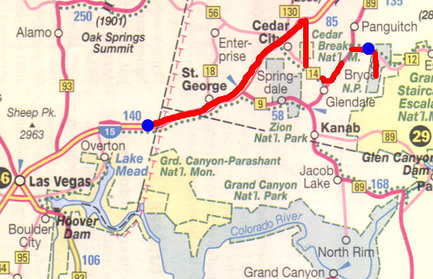 Nachdem wir unsere Wandertour beendet hatten, genossen wir noch eine Zeitlang das herrliche Bryce Canyon Panorama und machten eine kleine Mittagspause um unser nächstes Ziel "Cedar BreaksNational Monument" anzusteuern... Wir fuhren also wieder auf den altbekannten Highway 89 Richtung süden, um dann nach 1 Stunde rechts auf den unscheinbaren Highway 14 Richtung westen weiter zu fahren.