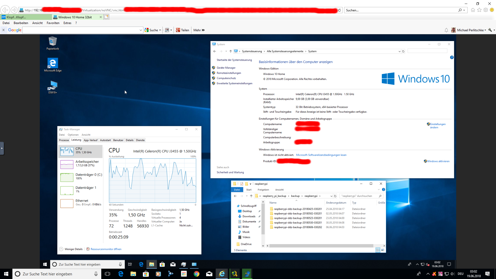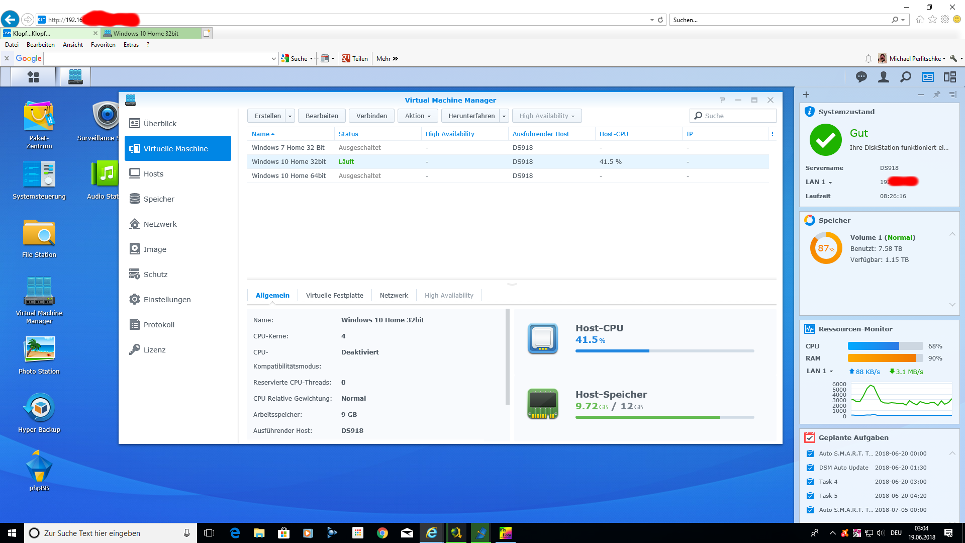 Somit sollten meine Nutzer und ich nun min. 6 Jahre lang Ruhe haben bei einer enormen Funktionalitaet, die allerdings auch schon auf der DS1010+ genauso vorhanden war. Freue mich nun auf die Virtuelle Maschine (also Windows) welche der eigentliche Grund fuer den Umstieg auf die DS918+ war, denn damit loese ich eine Menge sehr wichtiger Aufgaben. Habe eben mal testweise Windows 7 Home installiert (und 6GB RAM zugewiesen) und das flutscht ziemlich gut. Die Prozessorauslastung steigt wenn dort einiges passiert auf 50-70% pegelt sich allerdings immer so zwischen 30-35% ein ohne das es die Performance des NAS merklich negativ beeinflusst. Auch ein paar Windows Applikationen die ich staendig nutze sind schon installiert und das ganze funktioniert echt super. Somit kann ich nun aus der ganzen Welt per VPN-Verbindung auf diese virtuelle Windows 7 Maschine springen und diese ganz normal benutzen und natuerlich auch damit arbeiten. Netzwerkverbindungen wurden auch erstellt, sodass ich mich nun auch mit der virtuellen Maschine des kompletten Datenbestandes des NAS bemaechtigen kann. Das eroeffnet nebenbei ungeahnte neue Moeglichkeiten auch in Sachen Daten-Automatisierung. Ganz grosses Kino...