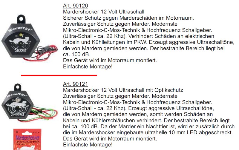 P.S: Nun kann ich auch meinem anderen Nissan-Haendler in Luetjenburg gruenes Licht fuer die bestellten und totschicken beleuchteten Einstiegsleisten samt dem Wintersatz ( 900 Euro fuer alles, ich hatte drueber bereichtet ) geben und einen Termin abschnacken. Bei der Gelegenheit lass ich auch einen neuen "Secoruett Mardershocker" einbauen. Denn den gibt es nicht nur im KFZ-Grosshandel. Nein, auch seit kurzem bei Conrad-Elektronic: Siehe hier http://www.conrad.de/ce/de/product/8560 ... Detail=005. Seit 2003 also >7 Jahren nutze ich die Secoruett-Mardershocker Modell 90120 ( anfangs im Nissan Almera N15 und bis heute einen zweiten identischen 90120 im Nissan Almera N16 ) und hatte seitdem keinen Angriff oder Beschaedigung mehr zu beklagen. Diese Kisten funktionieren 100%ig und ich werde in meinem Qashqai das neue Modell 90121 ( diese besitzt auch noch ein helle LED-Laterne und ist sonst identisch zum super funktionierenden 90120 ) einbauen lassen...