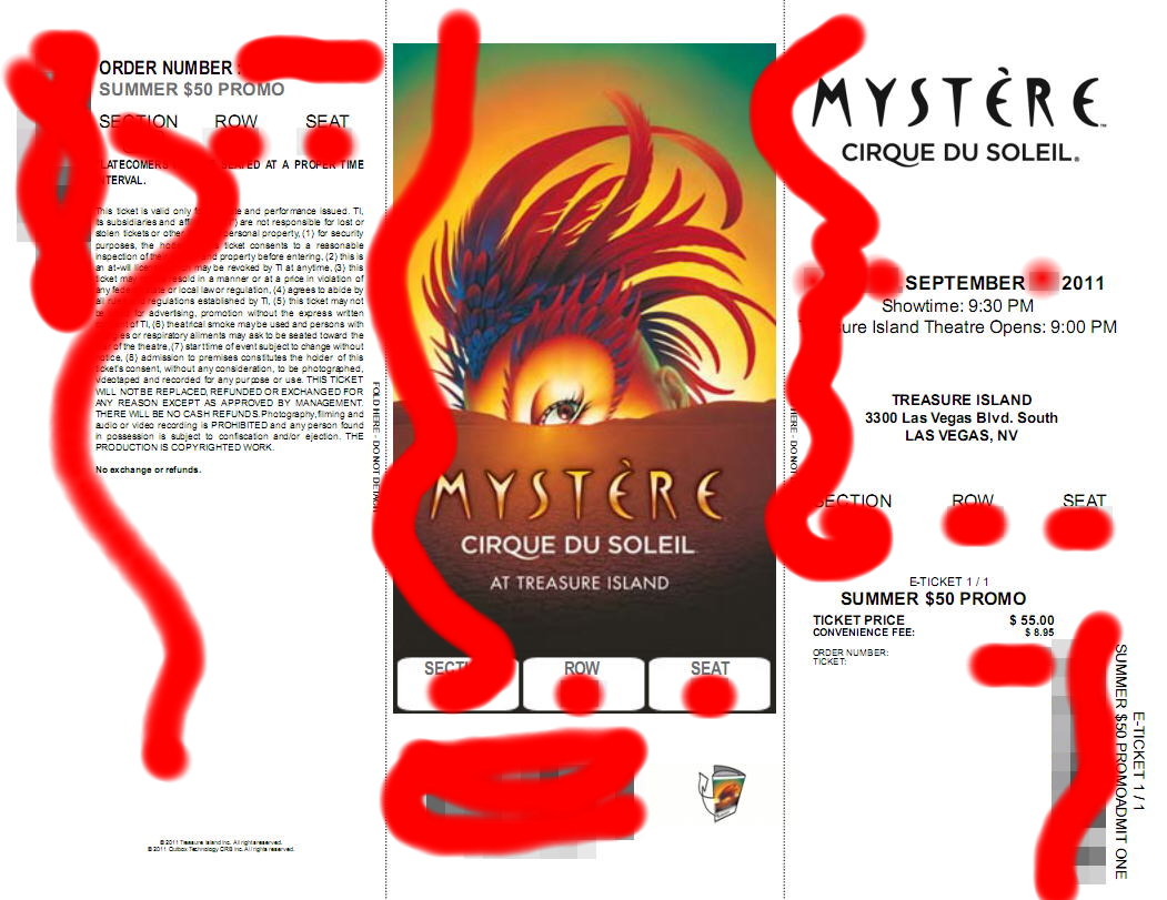 keiner Tipp, habe gerade Cirque Du Soleil -Mystere- im TI zur Summer 50US$ Promo geschossen. Inkl. aller Gebuehren ( Show-Tax und E-Ticket ) nur 63US$ (resp. 45 Euro). Das interessante ist aber, das der identische Sitz-Platz ueber die regulaere TI-Website gebucht 108.90 US$ ( mit Steuern und E-Ticket 122, 85 US$ ) kosten wuerde.