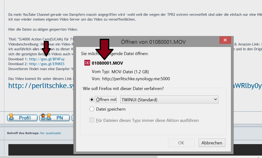 Ok, mein PC will jedenfalls beim Klick "Download 1" eine MOV Datei runterladen.....aber egalMichael hat geschrieben:Es handelt sich bei allen meinen Videos um waschechte MP4 Dateien...Thömu hat geschrieben:MOV-Dateien wurden im QuickTime-Format von Apple gespeichert.depot69 hat geschrieben:Hallo Perle,
