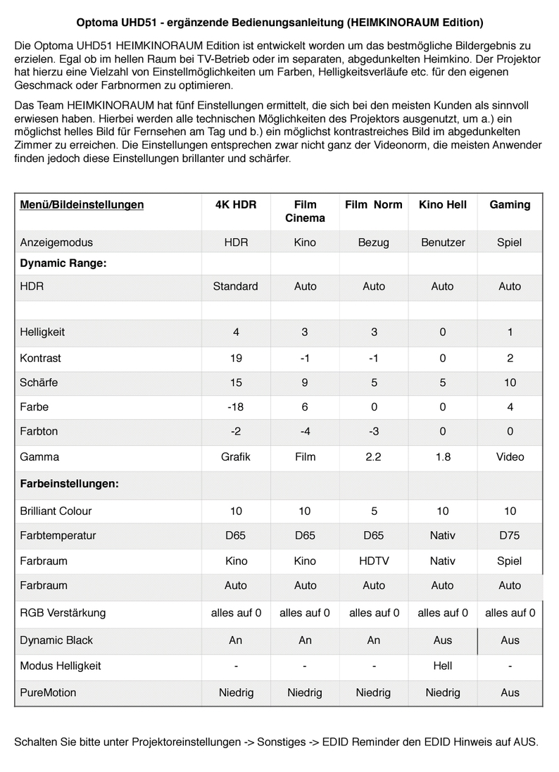 Nun kommen wir zu den einen Beitrag vorher gezeigten Heimkino-Raum Edition und Empfehlungen. Mit diesen Einstellungen (korrekt sollte man hier von Verschlimmverbesserungen schreiben) ist es nicht (!!!) möglich den Optoma UHD51 korrekt zu kalibrieren, da man sich damit den Beamer komplett versaut. Sicherlich, es sind Shocker-Einstellungen und diese funktionieren, aber die Farbtemperatur liegt boese daneben und auch die Farben selbst stimmen nicht. Selbst Helligkeit und Kontrast stimmen nicht! Eigentlich stimmt mit den Einstellungen rein garnichts. Es sind einfach subjektive Einstellungen die sich da scheinbar irgend jemand "ausgedacht" hat. Also die ueblichen in meinen Augen gruseligen Haendler-Einstellungen die zwar irgendwie funktionieren, aber den UHD51 faktisch Verschlimmbessern! Fuer Menschen ohne entsprechende Colorimeter-Hardware nur eine Einstell-Option (wenn auch in meinen Augen eine sehr schlechte).