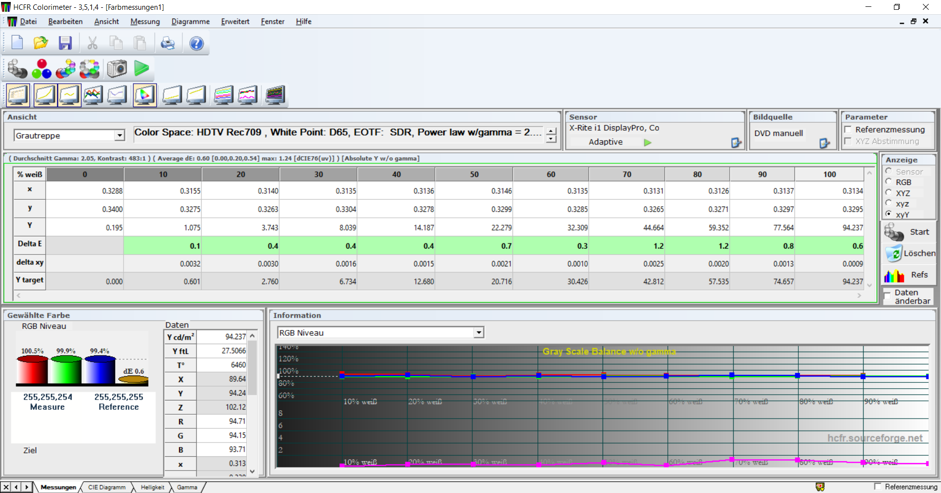 Hier die entsprechenden Screenshots für die Grautreppe und die 3+3 Primärfarben nach der Kalibrierung (alle Bilder können durch anklicken vergrössert dargestellt werden!). Das Delta-E liegt bei der Grautreppe <1 was absolute Spitzenwerte sind ist und auch die Primärfarben liegen nach der Kalibrierung mit einem Delta E von weniger als <2 auch auf einem erstklassigen "gruenen" Spitzen-Niveau: