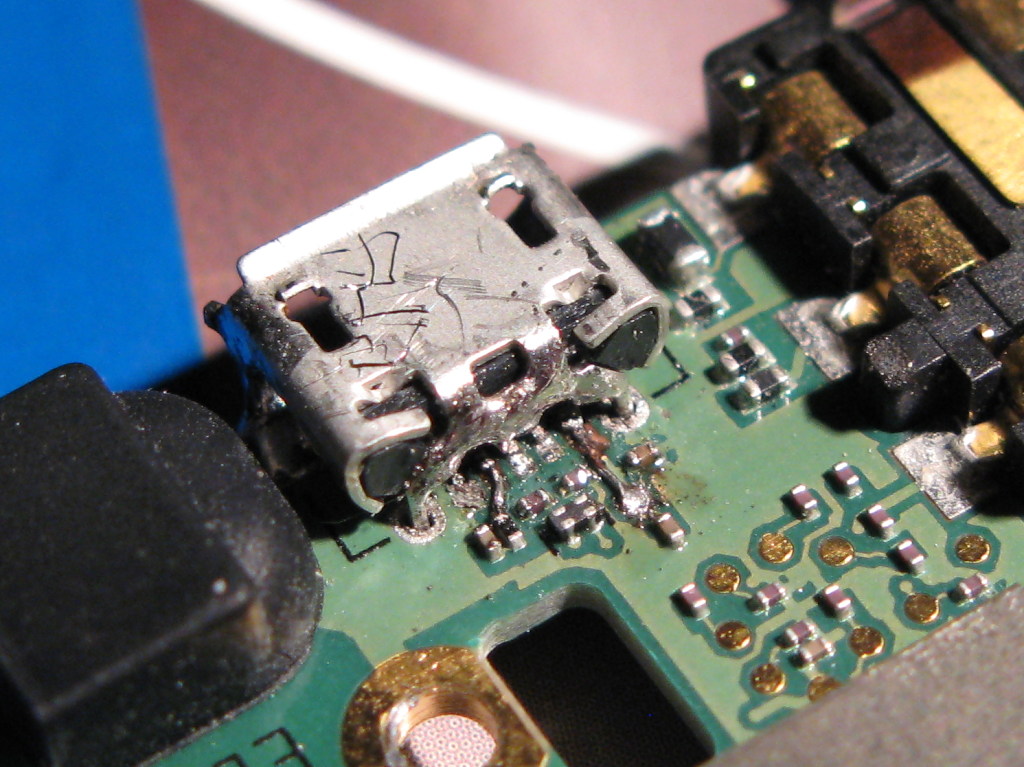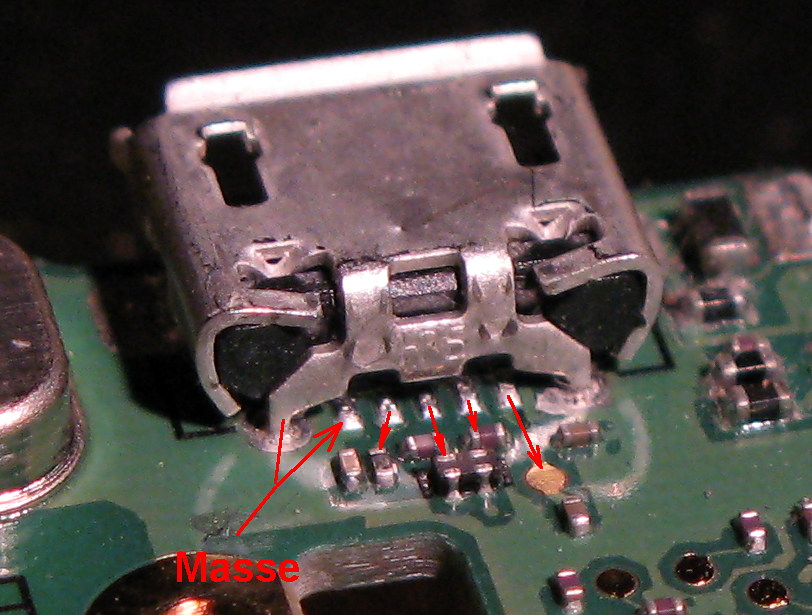 8.) Nachdem nun alle 5 Pins wieder elektrisch Kontakt mit dem Mainboard des HD2 besitzen, wenden wir uns nun der Fixierung des USB-Connectors zu. Dieser wird mittels 4 Masse-Pins ( zwei vorne und zwei hinten ) an der Hauptplatine gehalten, sodass man diese nur mit Roher brachialer Gewalt (was ja ??brigens auch zu unserem Problem gef??hrt hat) rausreissen. Mit dem L??tkolben nun unter Zugabe von frischen Zinn diese Masse-Halteverbindungen in die Hauptplatine einschmelzen. Da eine Menge W??rme in das USB-Metallgeh??use abwandert muss man an den Stellen etwas L??nger Hitze zuf??hren bis die Durchkontaktierungen homogen aufschmelzen und die Masse-Pins sich mit der Hauptplatine l??ttechnisch sauber verbinden. Auf der Seite mit dem Mirophone muss man nicht sonderlich aufpassen. Auf der andere Seite bitte auf den recht dicht sitzenden grossen Widerstand achten...IMHO ist das aber mit der Bleistiftl??tspitze sehr einfach. Nachdem wir vorne fertig sind, f??hren die Prozedur auch an den hinteren beiden Masse-Halterungen durch...