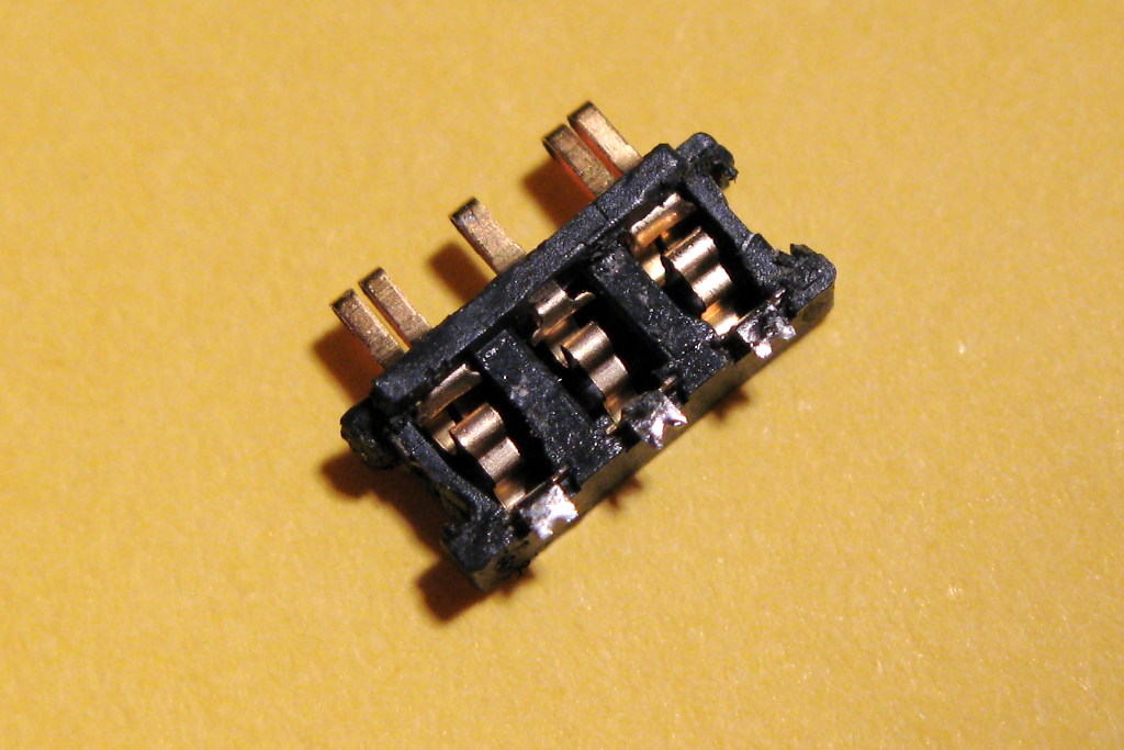 Das Akku-Kontakt Modul mit den 3 Kontaktfedern besteht primaer aus einem schwarzen Kunststoffgehaeuse in dem die drei Kontakfedern sehr simpel eingeklipst wurden. Die hinten aus dem Gehaeuse rausragenden Lotflaechen sind elektrisch mit der Leiterplatte verbunden. Das schwarze Gehaeuse wird rechts und links auf der Platine mittels vergleichsweise massiv eingeloeteter Metallstege sehr exakt in Position gehalten.